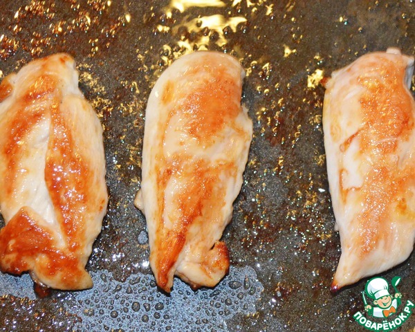 Куриное филе обжарить на растительном масле с двух сторон, убрать и посолить.