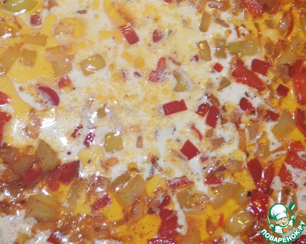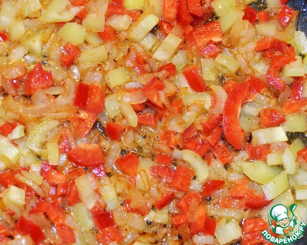 На эту же сковороду положить сливочное масло и обжарить лук + сладкий перец мелкими кубиками +чеснок мелко порубленный + смесь перцев