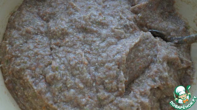 В эмалированную миску выкладываем куриный фарш, разбиваем яйцо. Лук, морковь, капусту чистим, нарезаем, измельчаем блендером, выкладываем к фаршу, солим, перчим. Овсяные хлопья измельчаем в муку и тоже отправляем в миску. Все ингредиенты смешиваем, взбиваем ложкой в пышный фарш.