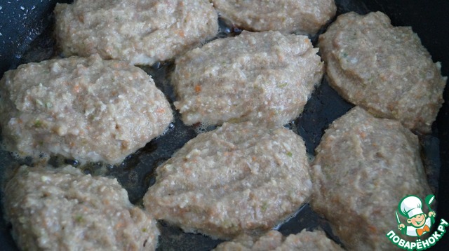 Формуем котлеты столовой ложкой, на разогретую с маслом сковороду с тефлоновым покрытием.