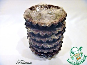Края пленки заверните вглубь корзинок, сложите корзинки стопкой, уберите в холодильник. Можно приготовить корзинки заранее, и хранить в холодильной камере несколько дней.