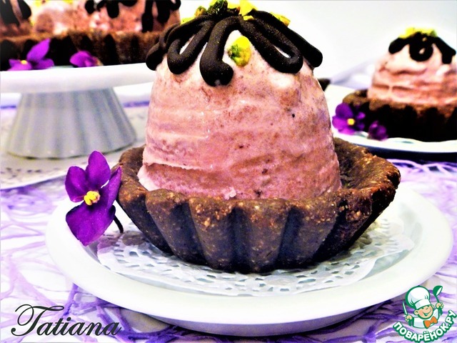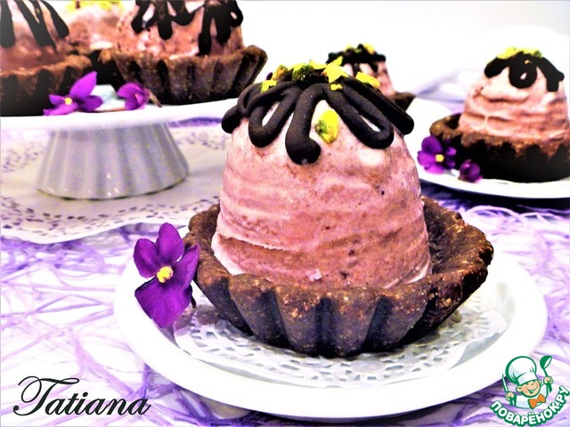 Готовое (замороженное) парфе выложите в корзиночку, сверху полейте шоколадной глазурью и посыпьте рубленными фисташками. -
