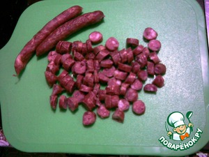 Режу колбаски и добавляю к картошечке, которая уже даже слегка разварилась, к чему я и стремилась