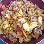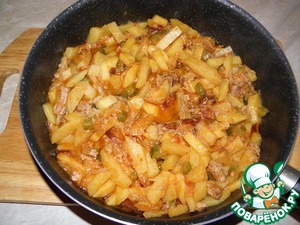 У меня оставалось штук пять варёных картофелин (папа делал венигрет), добавила ещё три сырых (предварительно обжарив их на... подсолнечном масле Слободы). К луку добавляла зуб чеснока, обычной пшеничной муки не было положила вместо неё смесь цельнозерновой и ржаной, вместе с томатной пастой - помидорку и чуть-чуть молотой паприки. Из тушёнки у меня было "Рулька копчёная бескостная (Рузком)". И вместо обычного перца - смесь пяти перцев.