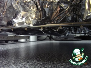 Алюминиевую фольгу оторвать размером больше на 20 см., чем длина рыбы. Сделать 3 слоя фольги. Смазать фольгу по размеру рыбы в середине растительным маслом. Я этого не сделала, и шкурка прилипла к фольге. А я очень люблю этот деликатес. Пришлось кусками отрывать от фольги.