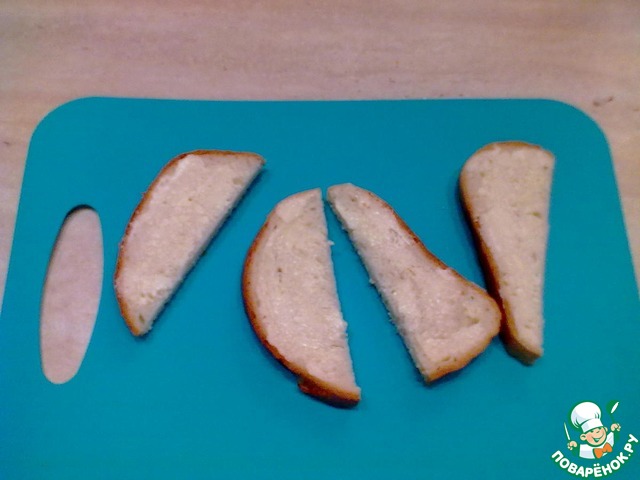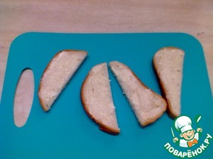 Ломтики батона разрезать наискосок, получается 4 основы для бутерброда. Если вам кажется, что такой кусочек маловат на одну порцию, делайте из целого куска.