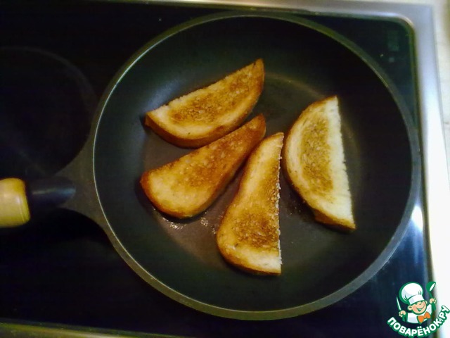 Поджарить ломтики батона на горячей сковороде до румяности. Снять и остудить на решетке, чтобы не отмякли.