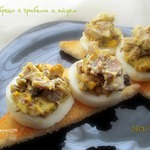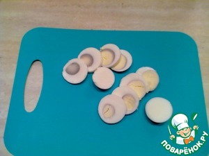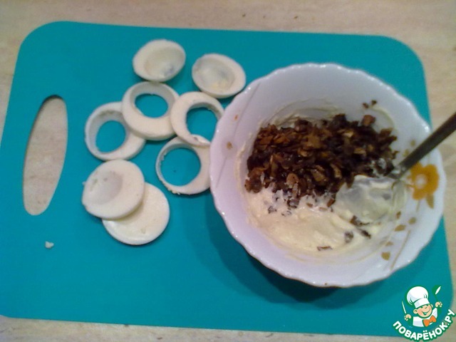 К желтковой массе добавить остывшие грибы, перемешать, выправить на соль.
