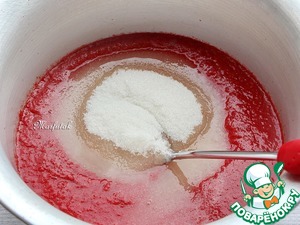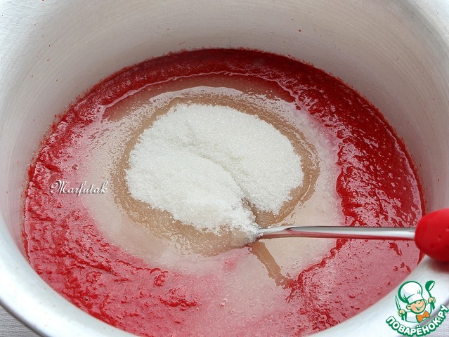 В пюре добавить сахар, перемешать, поставить на огонь и варить 5 минут с момента закипания.