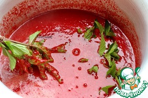 Пучок мяты завязать, опустить в кипящий джем и варить 10 минут. По истечении указанного времени мяту вынуть.