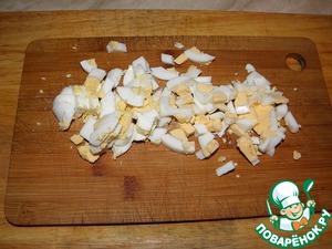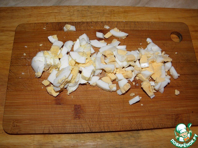 Яйца у нас уже готовы, нарезаем их небольшими кубиками