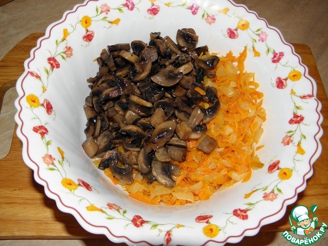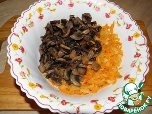 Морковь с луком выкладываем в посуду, затем грибы (если вдруг грибы впитали много масла, можно удалить его с помощью салфетки)