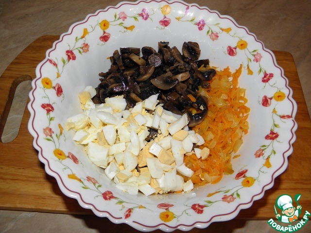 Яйца ставим варить, а тем временем подготовим другие продукты: Грибы промыть, очистить, нарезать небольшими кусочками, жарим на небольшом кол-ве раст масла на сковородке под крышкой! 15 минут ( это чтобы они сочными были)