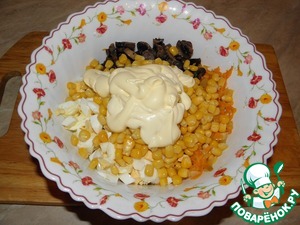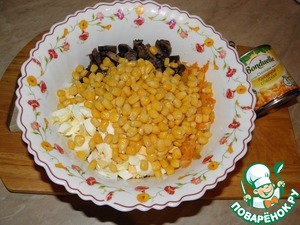 - Кукуруза ((у меня небольшая) сладкая консервированная) — 1 бан.