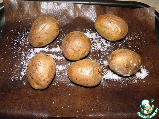 Начнем с того, что сливочное масло нарежем кусками и уберем пока в морозилку) Далее картофель белый, желательно одинакового размера хорошо моем, на противень насыпаем крупную морскую соль (она будет впитывать лишнюю влагу картофеля) и выкладываем картофель, запекаем картофель в мундире в духовке 180% до готовности. (не передержите, все зависит от сорта, величины и возраста) (некоторые упрощают этот вариант и просто отваривают его в кастрюле с крупной солью, но если мы хотим хоть немного приблизится к оригиналу, лучше запечь) и вообще так намного вкуснее)