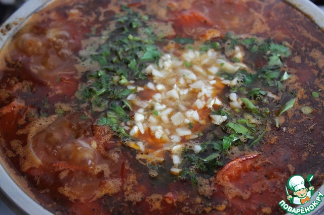 Добавить овощи в кипящий бульон и томить на медленном огне минут 15. Попробовать на соль, досолить при необходимости, всыпать все специи, мелконарезанные чеснок и зелень и томить еще 5 минут.