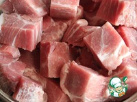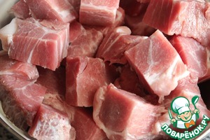 Нарезать мясо без жил и костей кусочками размером с грецкий орех.