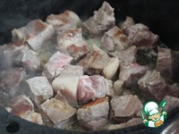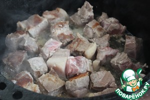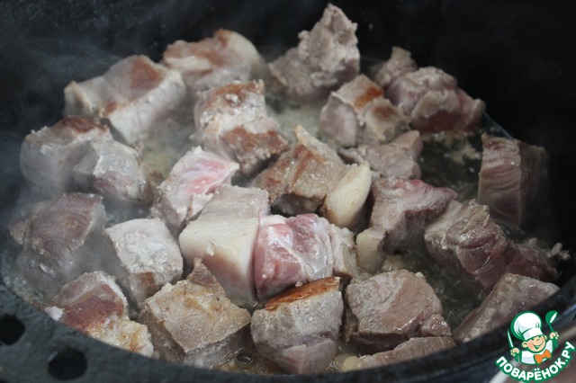 Смазать казан растительным маслом, раскалить его и в 2 приема обжарить мясо до корочки.