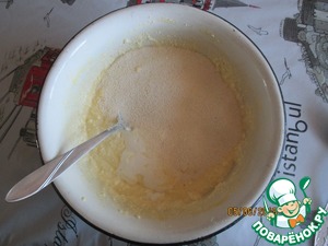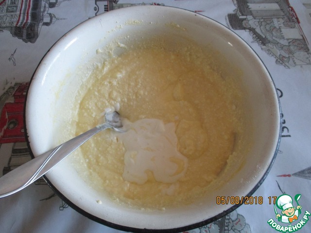 Добавить соду. Тут по желанию можете гасить или нет. Я когда вспомню гашу, не вспомню - не гашу. Принципиально ничего не изменится. Я гашу в столовой ложке сметаны или в 1/2 чайной ложке уксуса.