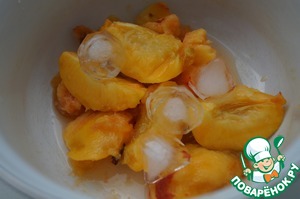 Удаляем из персиков косточки и очищаем кожуру. Складываем в чашу блендера и добавляем кубики льда (у меня 4 шт). Хорошо разбиваем блендером до однородной и воздушной массы.