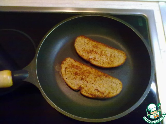 Поджарить на горячей сковороде с обеих сторон ломтики хлеба до нужной Вам румяности, либо подсушить в духовке.