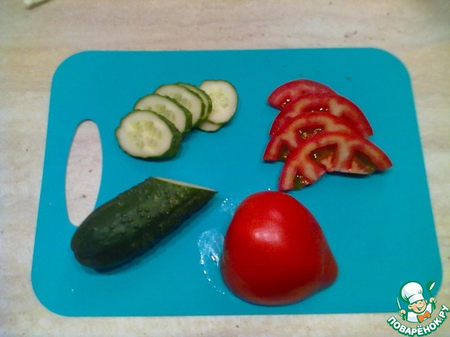 Помидор тоже кружочками, если он небольшого размера, у меня полу кольцами. -