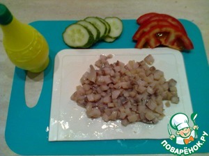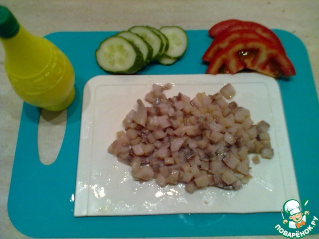 Филе сельди нарезать мелким кубиком и полить лимонным соком.