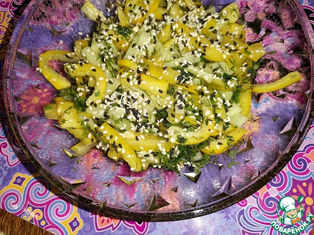 Перец порезать соломкой. У меня половина красного и половина жёлтого.