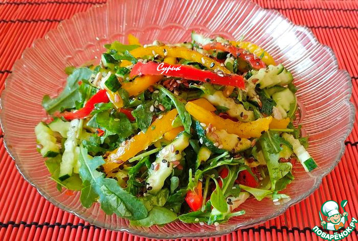 Сочный освежающий салат. Готовится за 5 минут. Приятный вкус придаёт ему заправка на основе лаймового сока и мёда.
