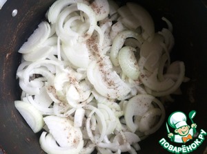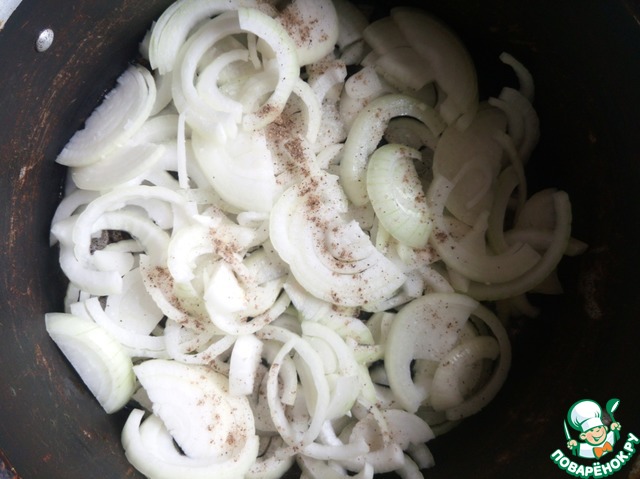 Укладываем в толстостенную кастрюлю или гусятницу овощи слоями, в таком порядке: лук, картофель, перец болгарский, чеснок.