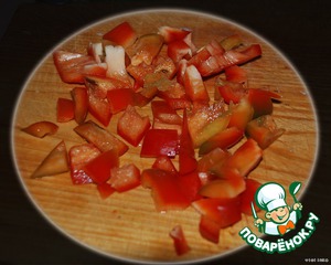 Мелко нарезать красный болгарский перец и тоже добавить в обжаривание, хорошенько перемешав.