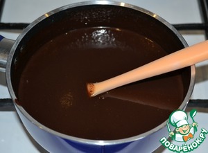 Не снимая с огня, постепенно вливать в приготовленную массу холодное молоко, тщательно перемешивая до однородной массы. Сотейник снять с огня и слегка остудить, примерно минут 8-10. Долго остужать не надо, так как холодное молоко уже наполовину своё дело сделало. В любом случае шоколадная масса должна быть тёплой.