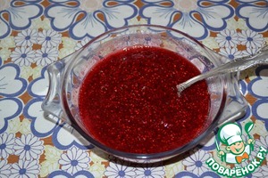 Пока остывает основа, приготовим неповторимый малиновый топпинг: малину засыпать сахаром и измельчить в блендере.