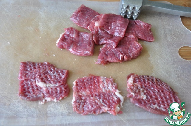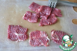 Мясо режем тонкими пластинками и отбиваем. -