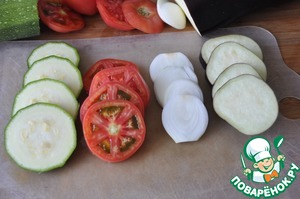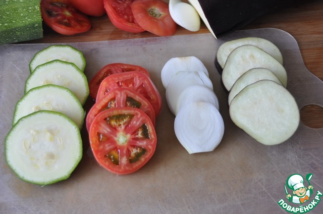 Для более эффектной подачи овощи рекомендую брать приблизительно одного диаметра. Режем баклажан, цуккини, помидор, лук кольцами (шайбами) толщиной около 1 см.