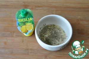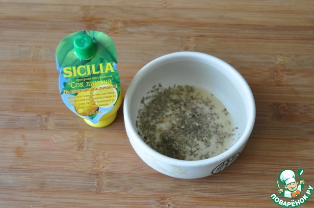 Готовим маринад. Берём сок лимона, лучше всего здесь подходит SICILIA, добавляем соль, свежемолотую смесь перцев, выдавливаем чеснок, кладём приправу "Прованские травы". Если вам не нравится эта приправа, то можете положить любые сухие травы по желанию. Перемешиваем.