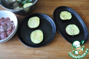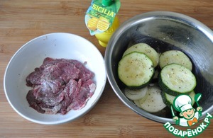 Половину маринада выливаем в мясо, хорошо перемешиваем. А в оставшийся маринад добавляем растительное масло и заливаем им цуккини, лук и баклажаны, перемешиваем.
