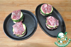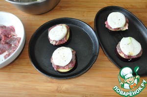 Далее кладём по кусочку отбитого мясного филе.
