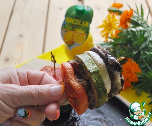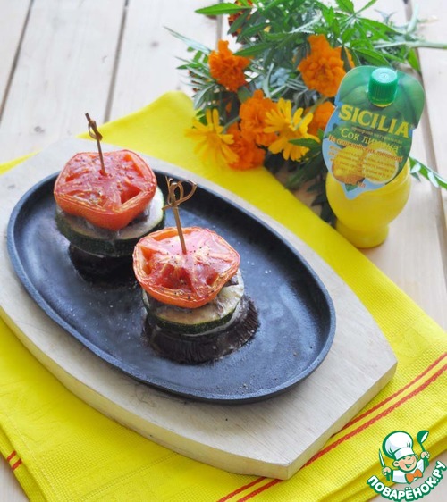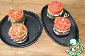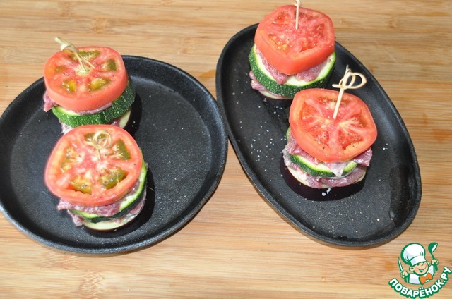 И в итоге сверху кружок помидора, слегка присыпаем его солью и смесью перцев. Протыкаем (скрепляем) деревянной шпажкой. Ставим в нагретую до 200 градусов духовку, запекаем 40 минут.