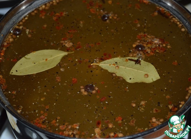 Приготовить рассол: в воде растворить соль и сахар, добавить все специи и прокипятить в теч. 5 мин.