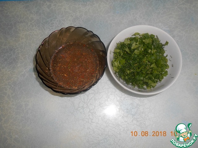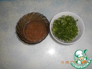• Зелень мелко режем, оставляем немного для украшения. Для острой заливки смешиваем в посуде пропущенный через чеснокодавку чеснок, соль, уксус 6 %, перец черный и красный и воду.