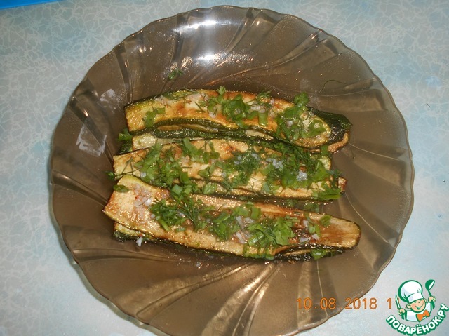 • В сковороде разогреваем растительное масло, у меня подсолнечное, и с двух сторон обжариваем кабачки до золотистого цвета (солить, перчить их не нужно). Обжаренные кабачки выкладываем на бумажное полотенце, пусть впитает лишнее масло. На блюдо выложить слой кабачков, полить заливкой, посыпать зеленью, следующие слои повторять. Оставить для маринования минут на 30. Закручиваем рулетики.