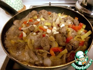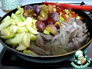 • В печень с луком добавить подготовленные овощи и фрукты.