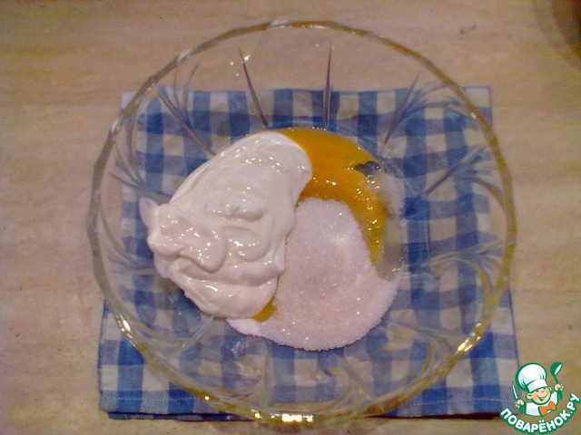 В миску всыпать сахар, добавить желток, соль, ванилин, сметану. Все хорошо соеденить венчиком до однородности и растворения сахара. -