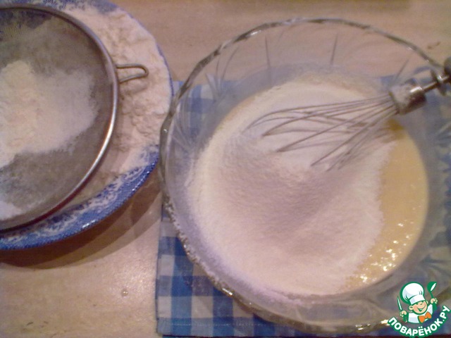 Далее всыпать просеянную муку и замесить тесто, сначала ложкой, а потом руками.