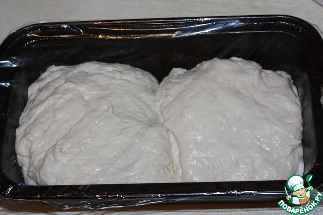 Сформуйте хлеб и положите в форму. Чтобы в форме расстаивалось равномернее, можно поделить тесто на 2 части, сформовать 2 шара и положить их в форму. Накройте пленкой.