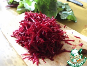 Свеклу вымыть, обсушить, отрезать ботву. Свеклу очистить, натереть на крупной тёрке.