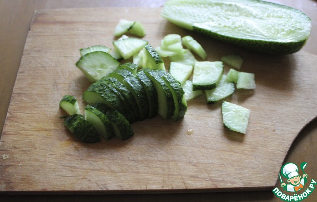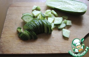 В каждую тарелку нарезать небольшой огурец.
