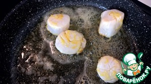 Когда гребешки в су виде готовы, обжариваем их на сильно разогретой сковороде в сливочном масле по 30 секунд на каждой стороне. Важно не пересушить гребешки.