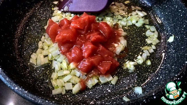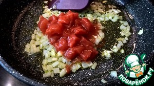 Добавляем томаты и сразу перемешиваем, чтобы чеснок не пережарился